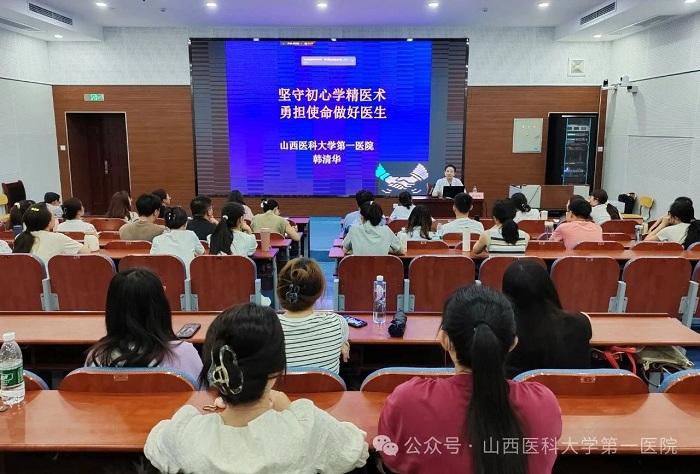 副院長韓清華以“堅(jiān)守初心學(xué)精藝術(shù),勇?lián)姑龊冕t(yī)生”為題,結(jié)合自己從醫(yī)三十多年的經(jīng)歷為學(xué)員們上了一堂精彩生動(dòng)的醫(yī)學(xué)人文課,寄語學(xué)員不忘醫(yī)者初心、踐行醫(yī)者使命,在三年的規(guī)培中學(xué)有所成,成長為一名合格醫(yī)生。